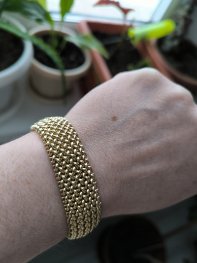 Долго думала, присматривалась и , наконец, решила себе сделать подарок. Покупкой довольна: браслет практичный, не цепляется, выглядит богато !и очень понравился цвет золота. Рекомендую