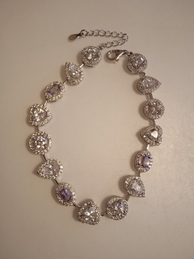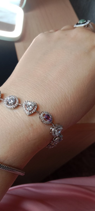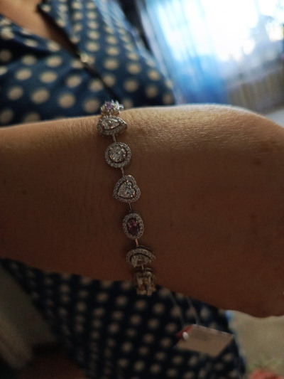 Мне этот браслет подошёл. У меня есть серьги сиреневые с прозрачными фианитами, с ними я ношу кольцо только с прозрачными фианитами (подходит стиль). Браслет тоже сочетается.