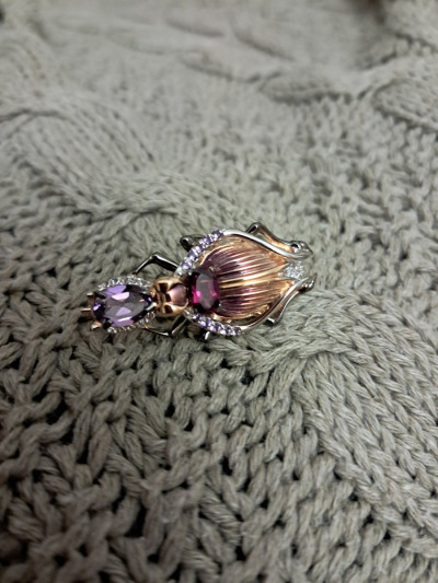 Золотая брошь с эмалью, родолит, топазами природными, аметистами природными и родолит природными