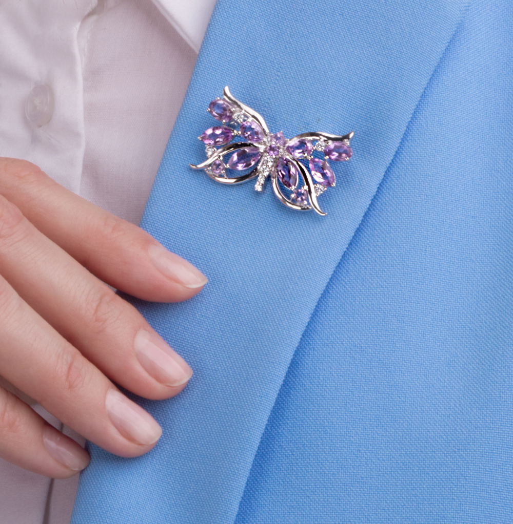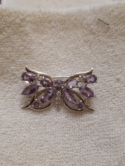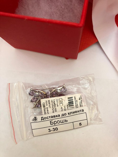 Серебряная брошь с фианитами и аметистами природными