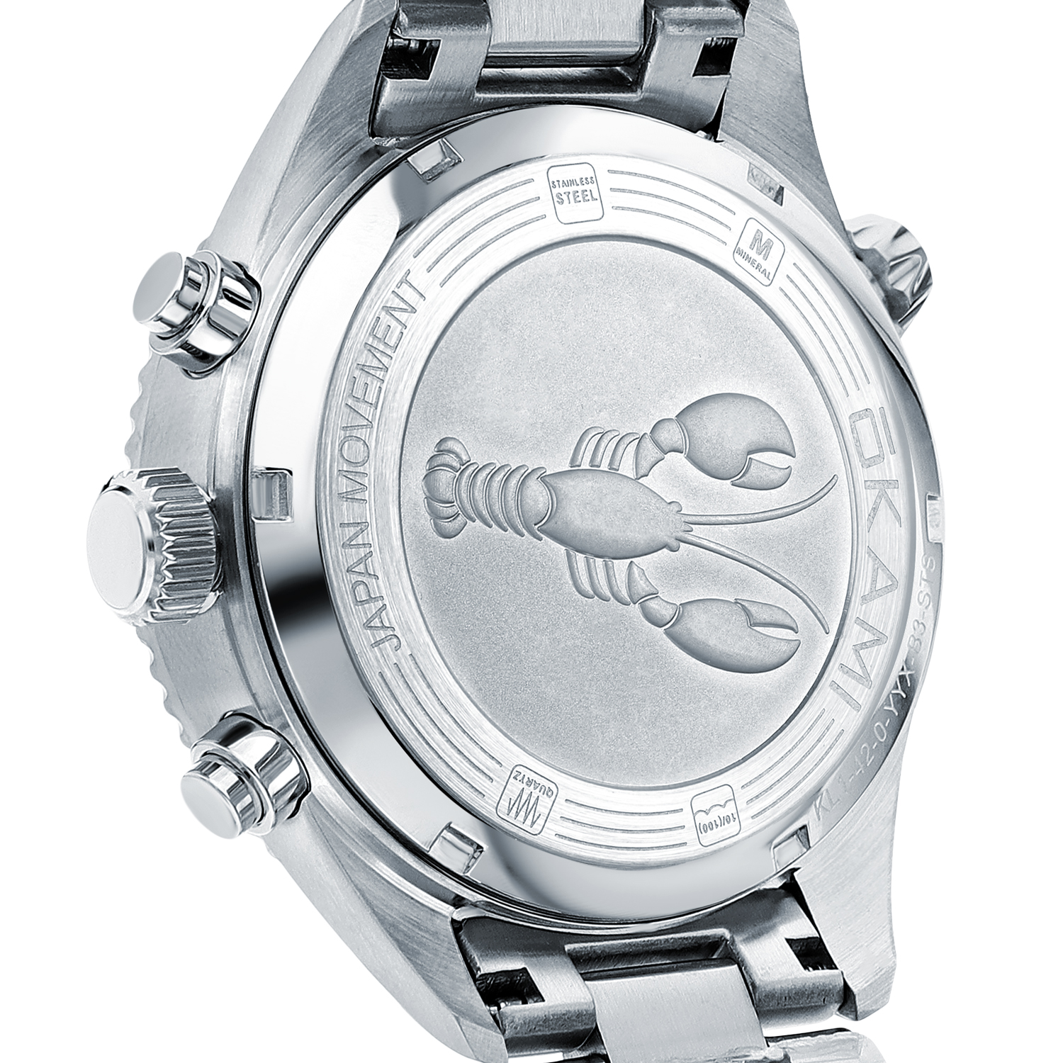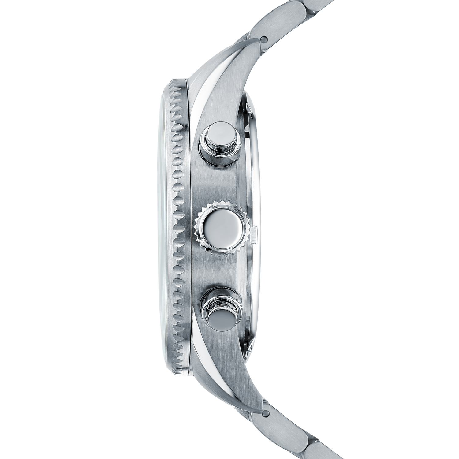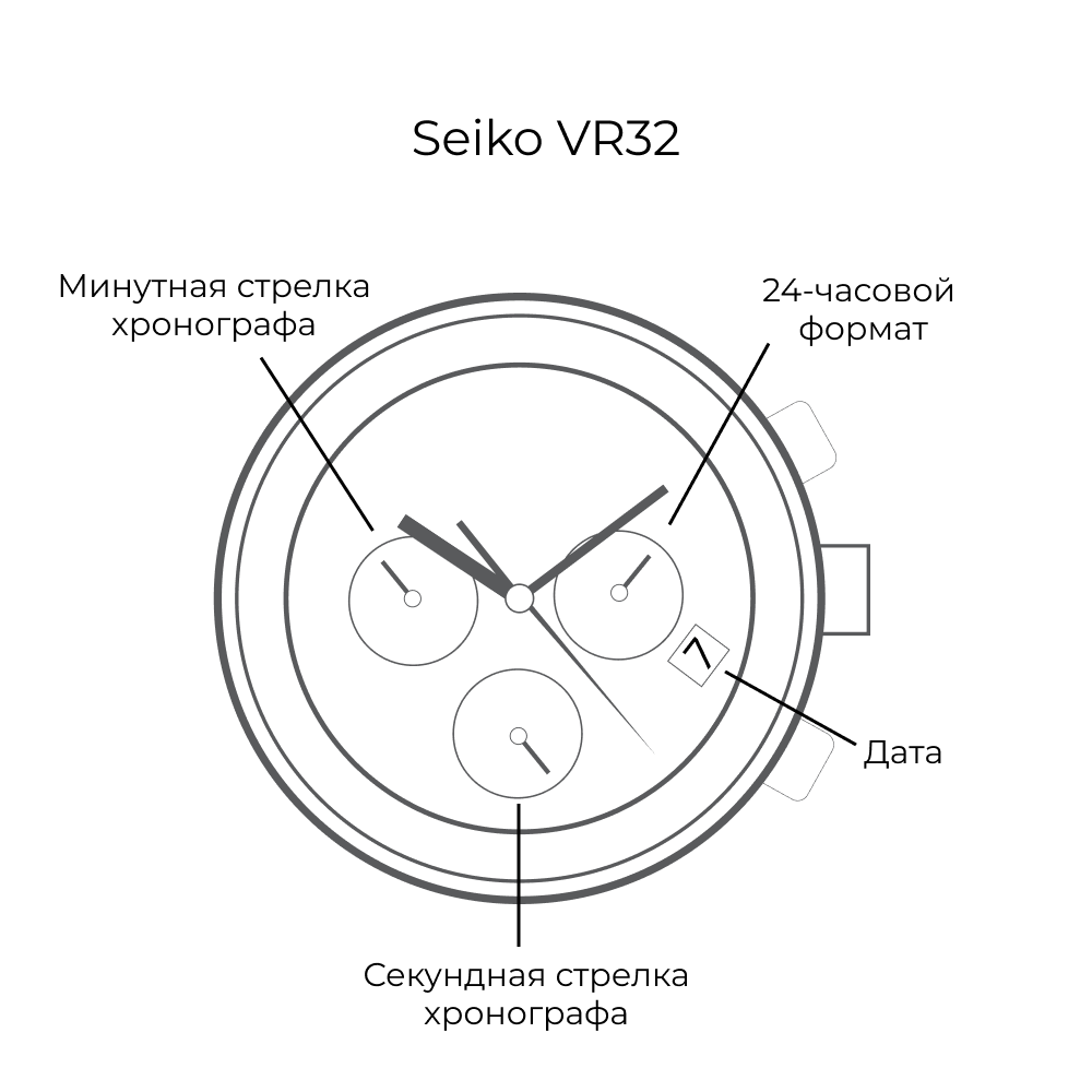 Корпус выполнен из стали, минеральное стекло с антибликом защищает циферблат от внешнего воздействия. Японский кварцевый механизм Seiko VR32 обеспечивает точный ход и оснащен функциями времени в 12 часовом формате, секундной стрелки, даты, дня недели и хронографа. Водозащита 10 bar (100 m/330 ft)* позволяет плавать в часах.
