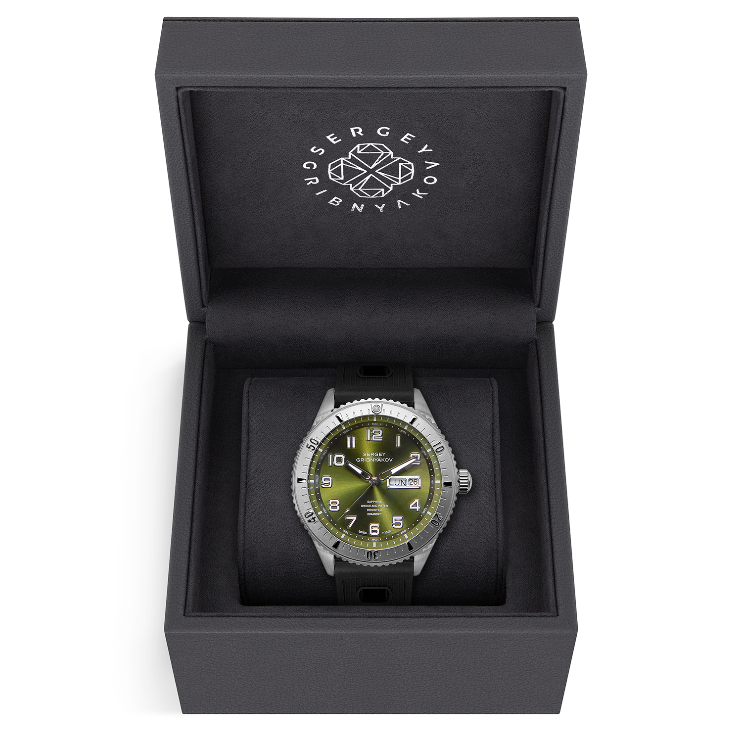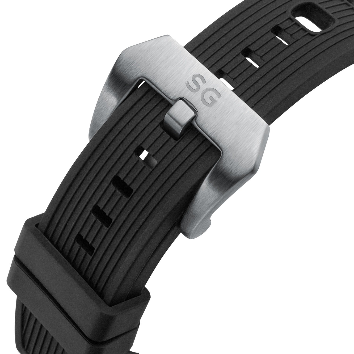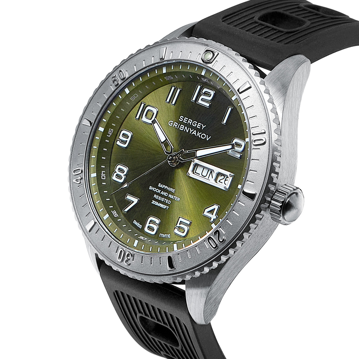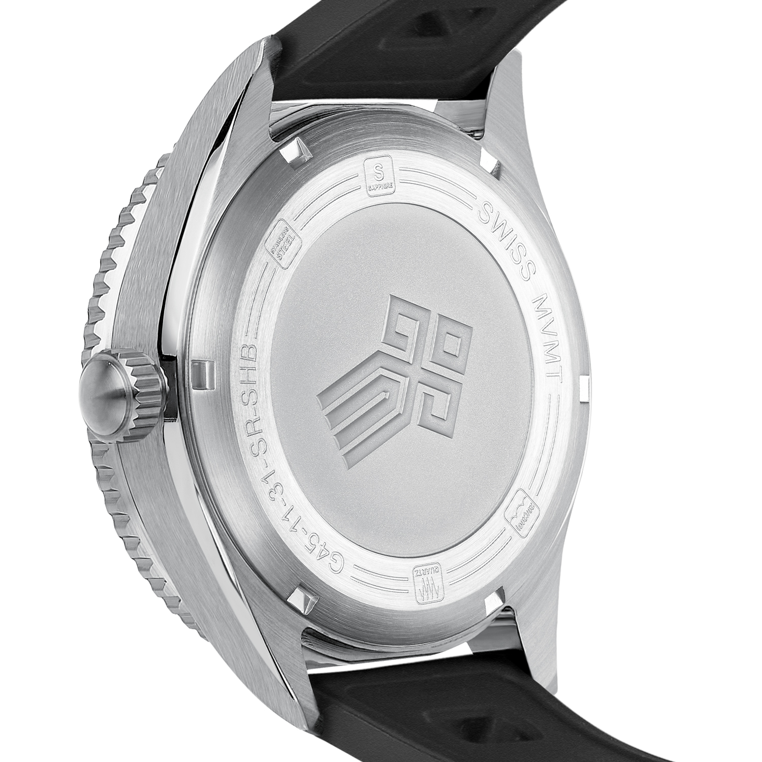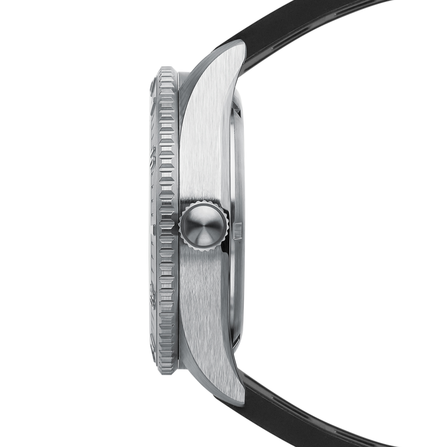 Корпус выполнен из стали 316L, сапфировое стекло с антибликом защищает циферблат от внешнего воздействия. Надежный швейцарский кварцевый механизм Ronda 517 оснащен функциями времени в 12 часовом формате, секундной стрелкой, датой и хронографом. Водозащита 20 bar (200 m/660 ft)* позволяет плавать и погружаться в часах.