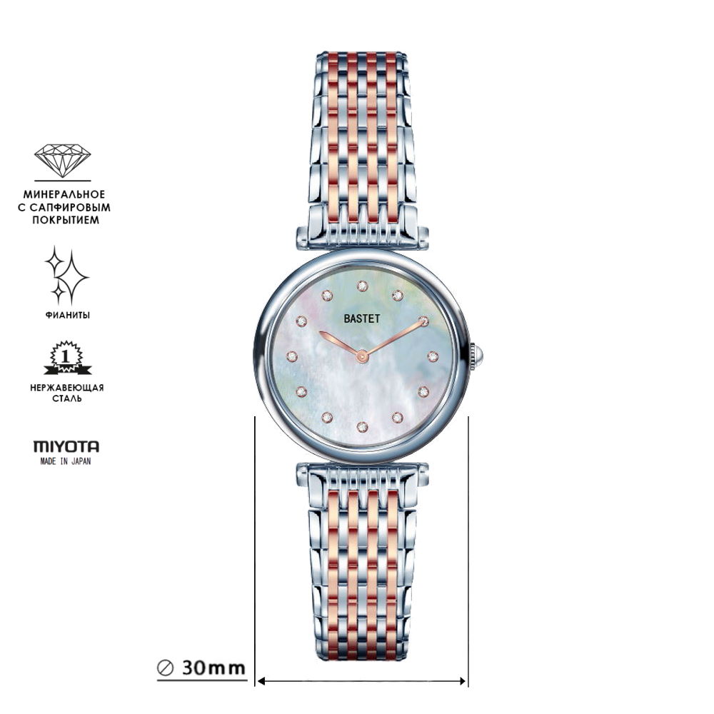 Корпус выполнен из стали 316L, минеральное стекло защищает циферблат от внешнего воздействия. Японский кварцевый механизм Miyota GL22 обеспечивает точность и оснащен функциями времени в 12 часовом формате. Водозащита 5 bar (50 m/165 ft)* позволяет мыть руки в часах, а так же защитит от брызг и дождя.