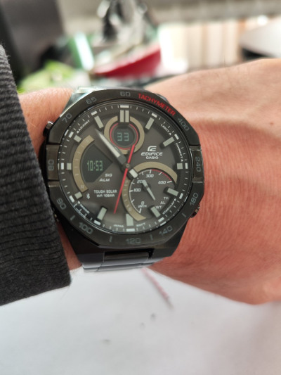 Перед вами супер стильная модель EDIFICE из аналого-цифровой серии Edifice ECB в корпусе ECB-950. Модель обладает новым динамичным дизайном с визуальными отсылками к автомобильному спорту: стальной октагоновый корпус с черным IP-покрытием защищает модуль часов от внешних повреждений, лаконичный темный циферблат с яркими красными деталями покрыт прочным минеральным стеклом и темным стальным безелем с IP-покрытием, а контрастные стрелки обеспечивают высокую эргономику модели. Начинка часов не отстает от внешнего вида: солнечная батарея, обеспечивающая часам неиссякаемый заряд энергии, технология Bluetooth®, позволяющая синхронизировать часы со смартфоном, высокоточный секундомер с шагом 1/1000 секунды, привычная для часов Edifice водозащита 100 метров и двойная светодиодная подсветка.