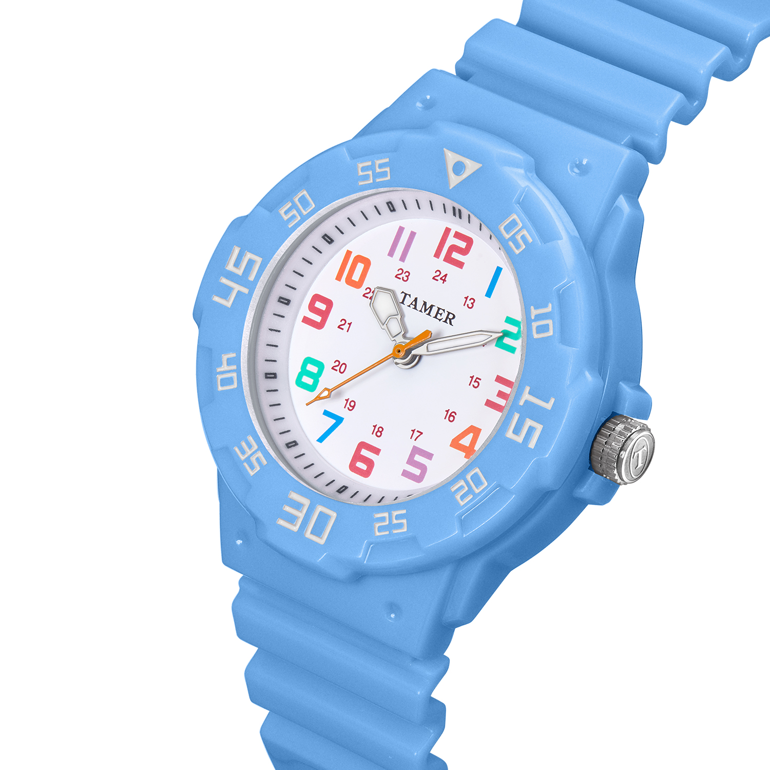 Коллекция ярких часов для малышей и стильных школьников. Первые часы, по которым ваш ребенок научится определять время. Корпус выполнен из пластика, акриловое стекло защищает циферблат от внешнего воздействия. Японский кварцевый механизм Seiko PC21S обеспечивает точный ход и оснащен функциями времени в 12 часовом формате и секундной стрелки. Водозащита 3 bar (30 m/99 ft) защитит от брызг и дождя.