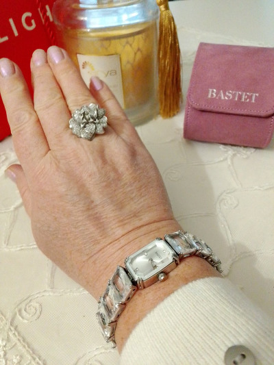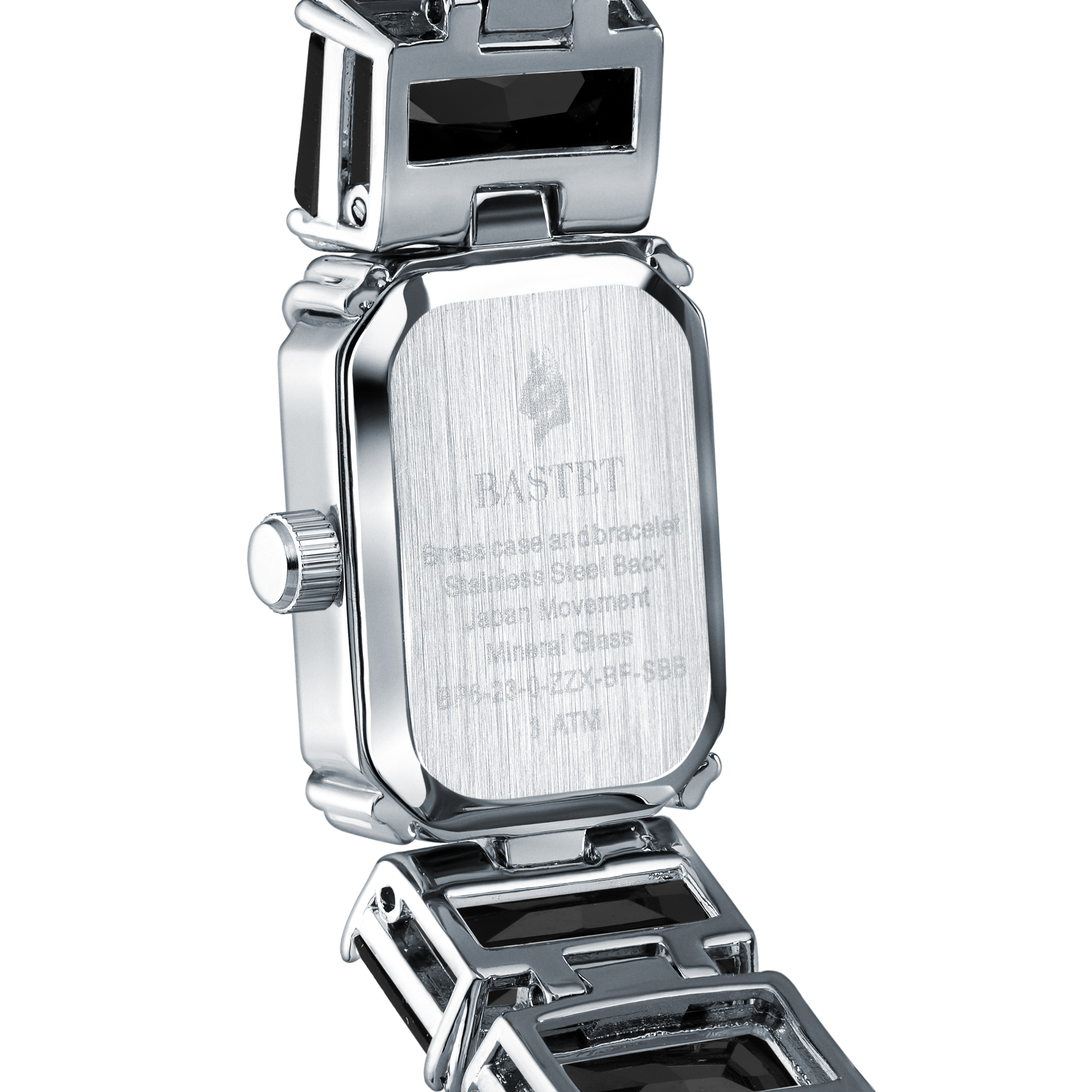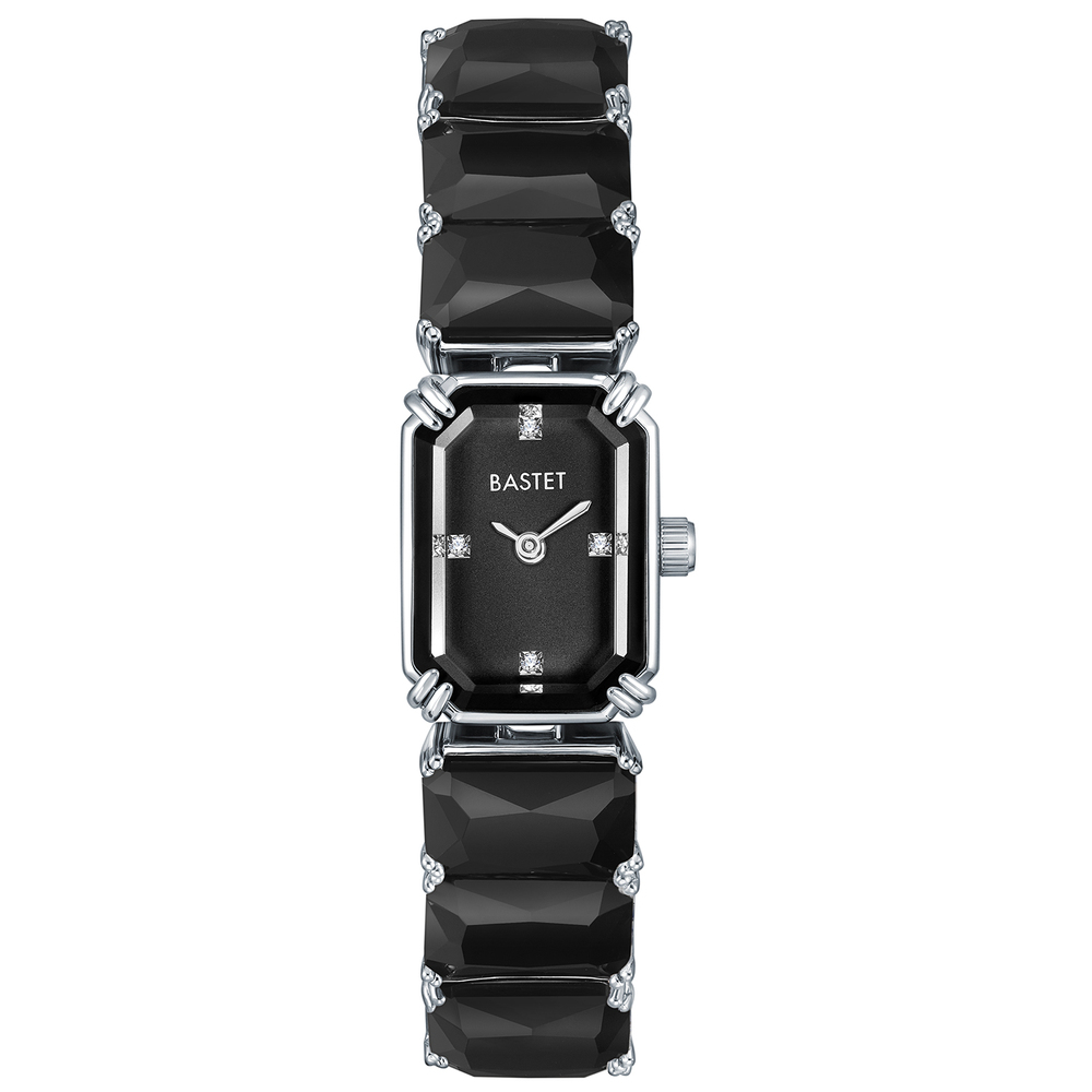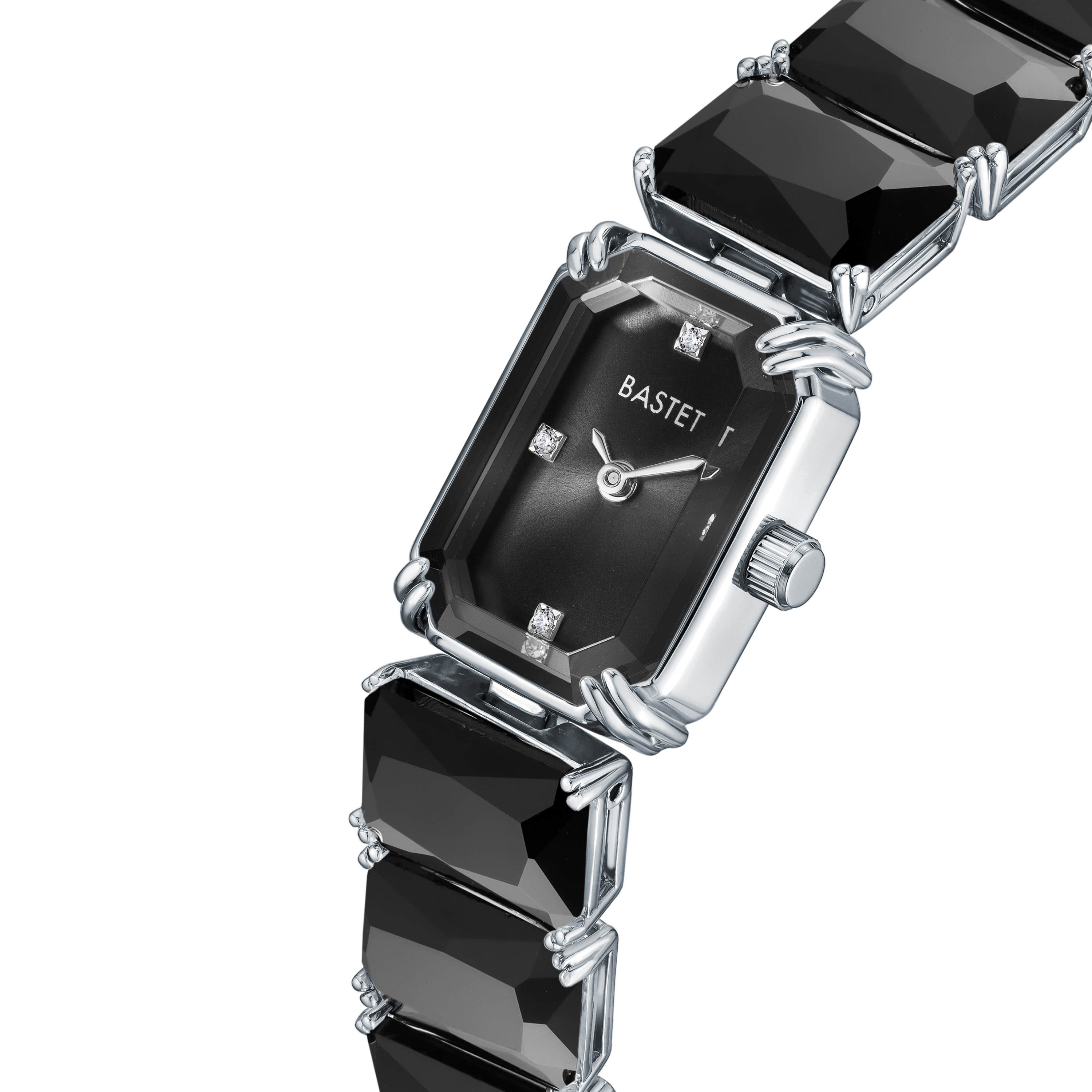 Кварцевые часы с японским механизмом. Корпус размера 23 мм с кристаллическим безелем. Черный циферблат циферблат с логотипом BASTET и метками в виде точек из кристаллов в положениях 12, 3, 6 и 9 часов. Мечевидные стрелки. Секундная стрелка отсутствует. Рифленая заводная головка. Стальной браслет с застежкой-бабочкой декорирован рядом крупных кристаллов из цветного ювелирного стекла огранки октагон.Водозащита 3 bar (30 m/99 ft)* защищает от брызг и дождя.