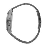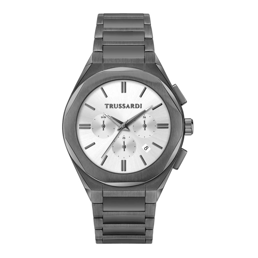 Наручные часы Trussardi, артикул R2453156003. Коллекция Brink. Мужские кварцевые часы в классическом стиле от модного итальянского бренда Trussardi. В часах установлен японский кварцевый механизм Miyota JP25. У часов центральное расположение стрелок. Стальной корпус диаметром 44 мм с серым IP покрытием. Серебристый циферблат. На дополнительных циферблатах реализованы функции: часовая стрелка в режиме 24 часа в районе 3 часовой отметки, режим второго времени GMT на 6 часовой отметке, день недели на 9 часовой отметке и окошко даты. Стальной браслет. Раскладывающаяся застежка с двумя кнопками. Минеральное стекло устойчиво к мелким царапинам. Водостойкость 5 АТМ (мытье рук, дождь). Страна производства - Италия. В комплект входит фирменная упаковка, гарантийный талон и инструкция на русском языке. Приобретая этот товар, Вы покупаете изделие от эксклюзивного дистрибьютора марки на территории РФ. ВНИМАНИЕ! Заявленная водостойкость гарантируется только при плотно закрытой или закрученной заводной головке!