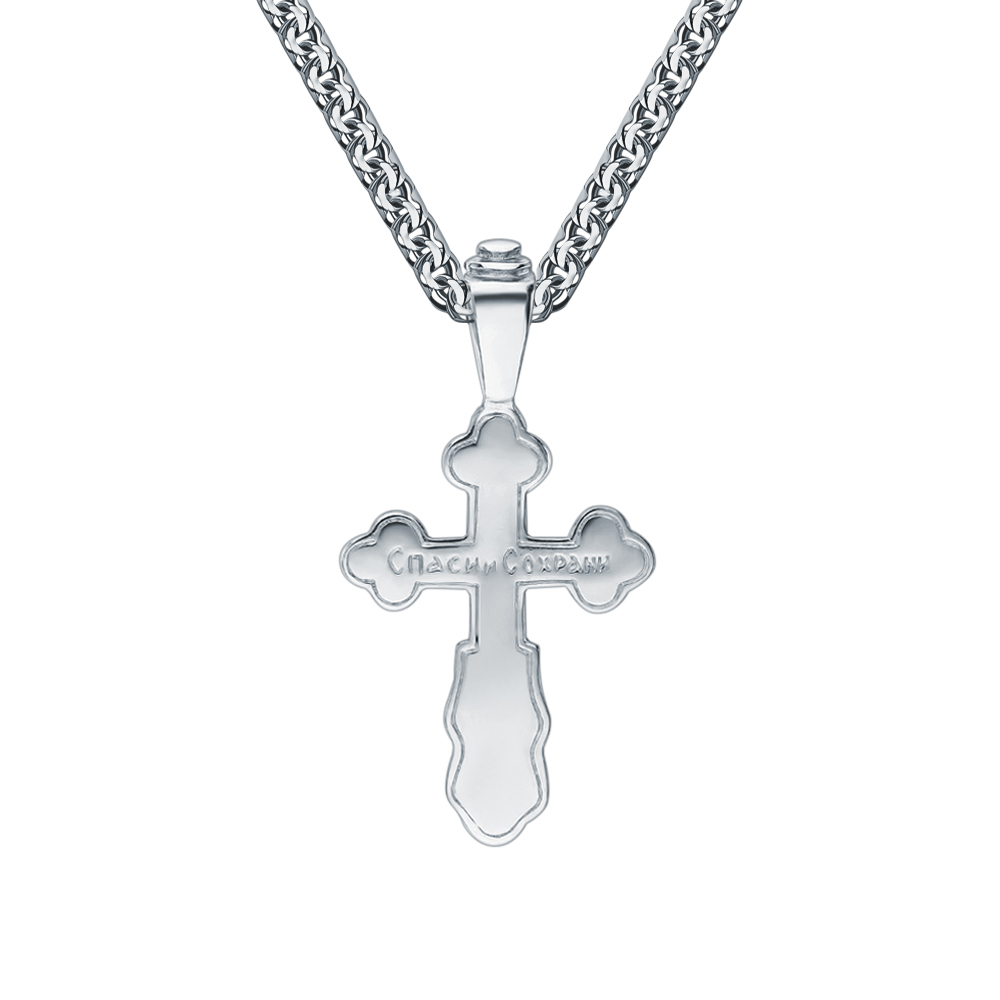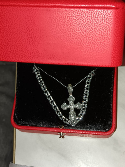 Крест среднего размера, ничего лишнего, с чернением, куплен для мужчины. Спокойный, без наворотов. Понравился. Цепочка в комплект якорное плетение 60 см, полновесная. Спасибо за скидки!