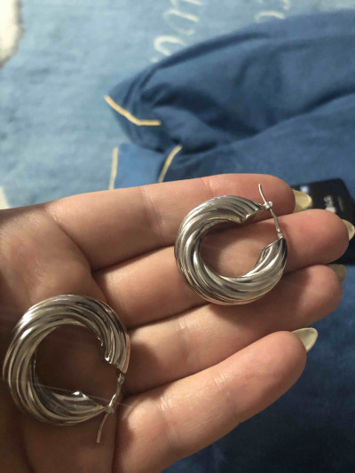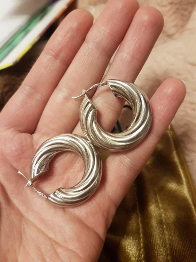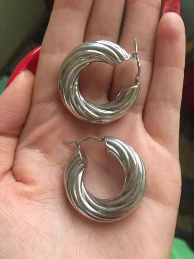 Серьги очень эффектные. Внешний диаметр 3см,внутри 1,6см. Объёмные,но лёгкие.