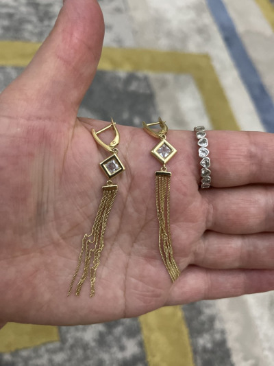 Серьги из лимонного золота, смотрятся шикарно! Приобретала вместе с кулоном и цепочкой! Очень красивый набор получился!
