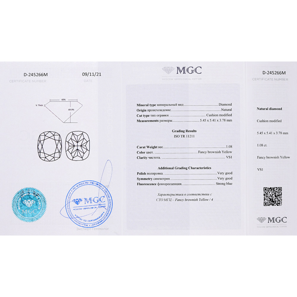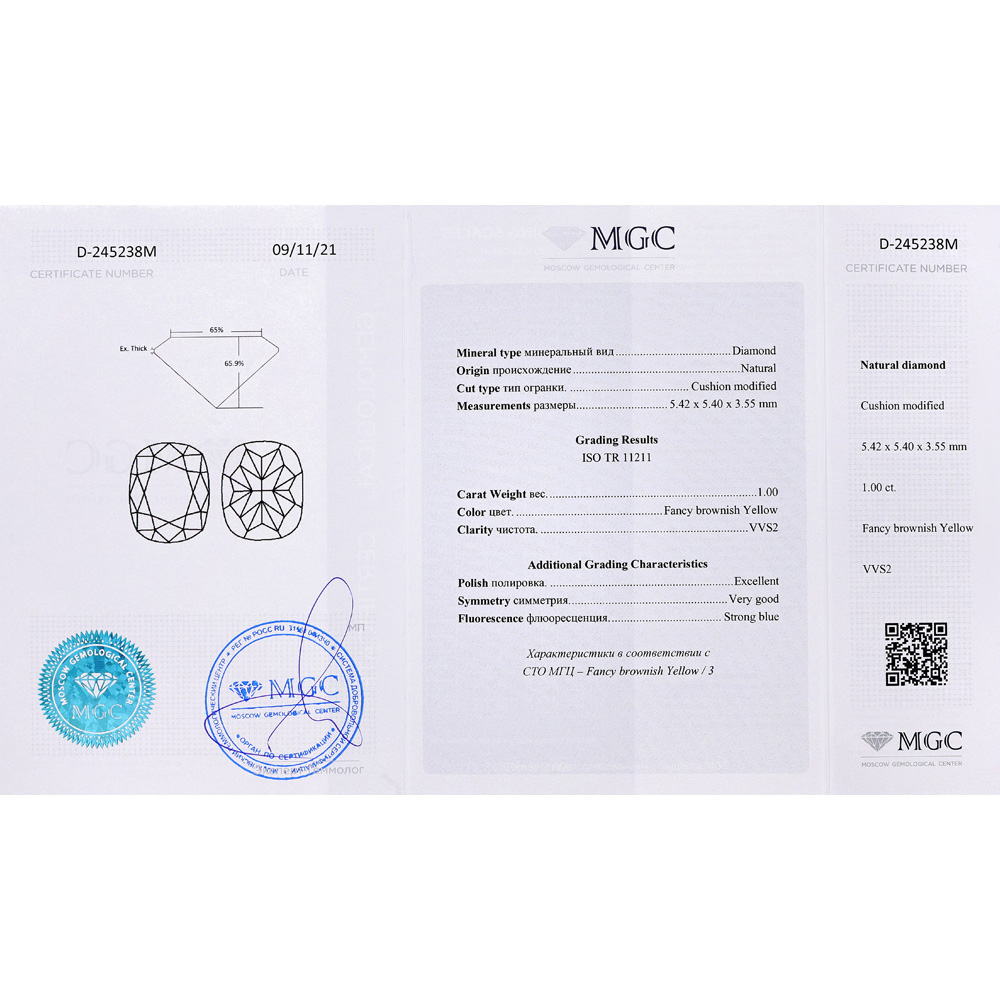 1 бриллиантом желтым природным, 1.01 карат, цвет 8-5, чистота 6, тип огранки Б;