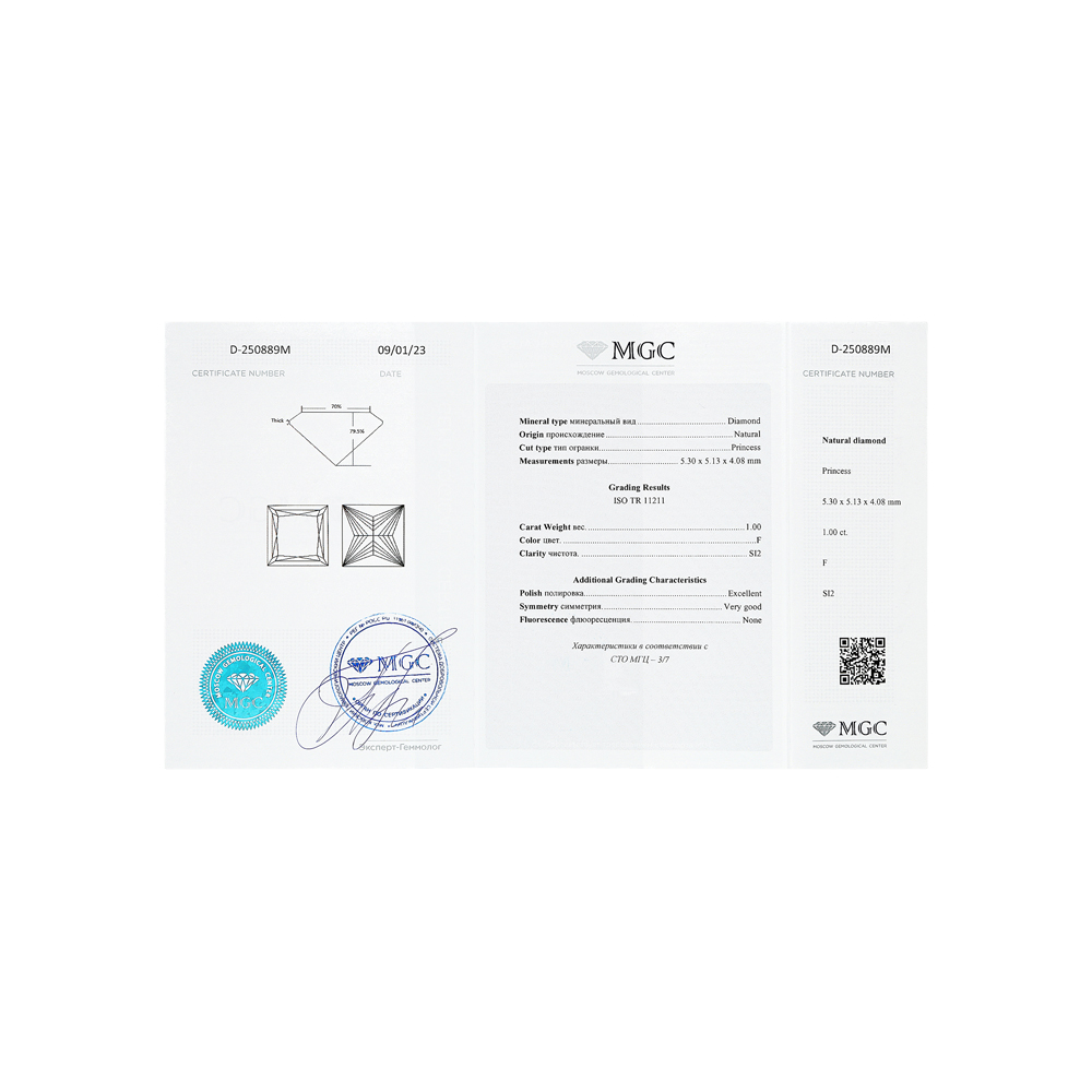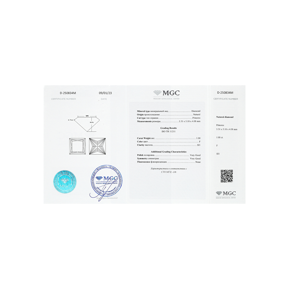 1 бриллиантом природным, 1 карат, огранка принцесса 65 граней, цвет 3, чистота 6, тип огранки А;
