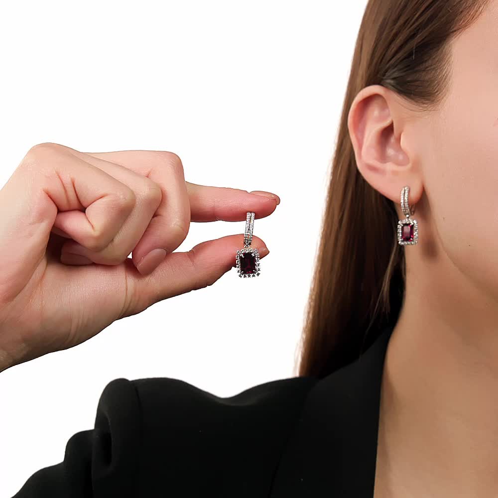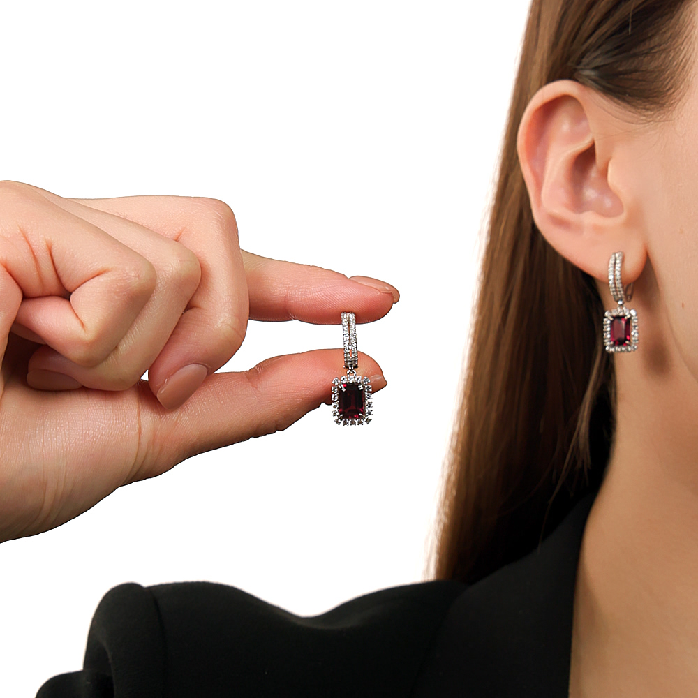 Эти серьги с гранатами – настоящее произведение ювелирного искусства, яркая классика драгоценных камней в оправе из белого золота, которое подчеркивает блеск бриллиантов и делает дизайн украшения современным.