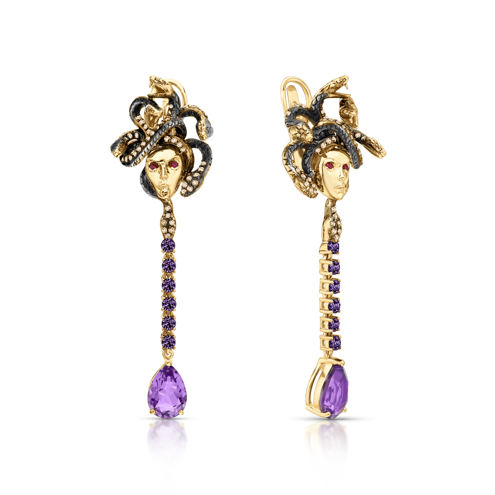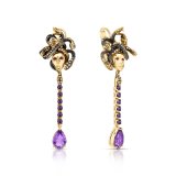 Золотые серьги с аметистами природными, рубинами природными и бриллиантами природными