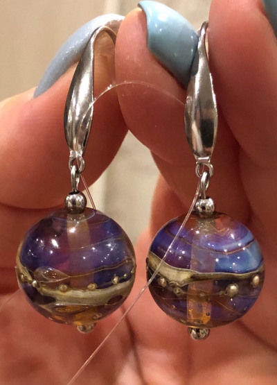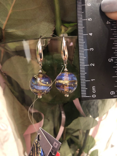 Очень красивое сочетание цветов. Фото на сайте не передает реальной красоты.Бусина слегка прозрачна. Вес 15гр. Длина серег 4 см . На швензе сзади есть фиксатор. Приятно , что все покупки в магазине оформляют в подарочную упаковку!