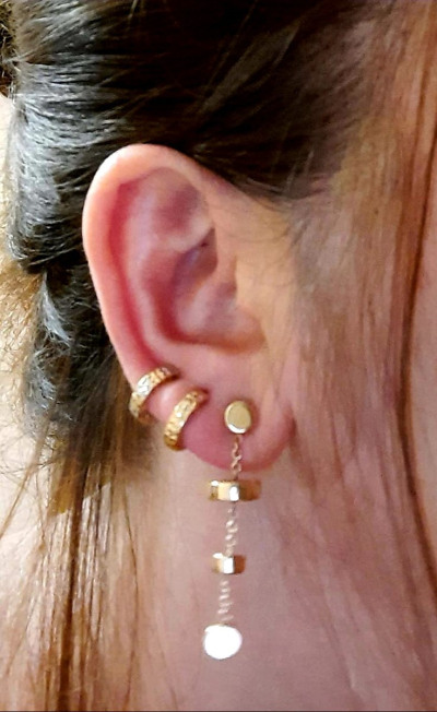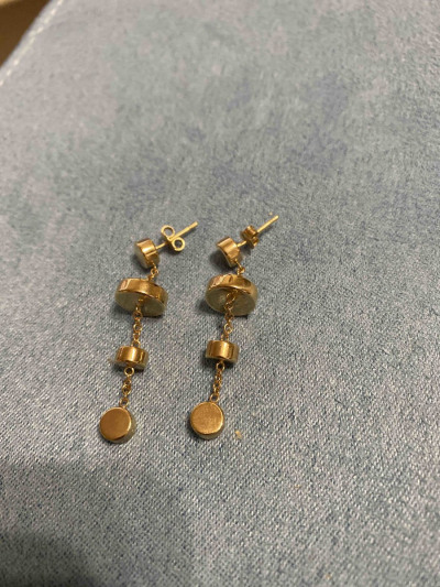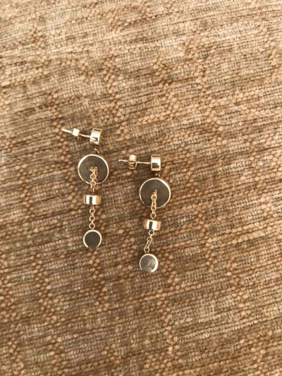 Если вы любите серьги геометрической формы, то эти серьги для вас! Выглядят дорого, покачиваются при ходьбе, глянец жёлтого золота блестит на солнце, эффектные, заметны окружающим. Замок- бабочка, пока сидит крепко, но как показывает практика разнашиваться, приготовила силиконовые заглушки. К покупке рекомендую.