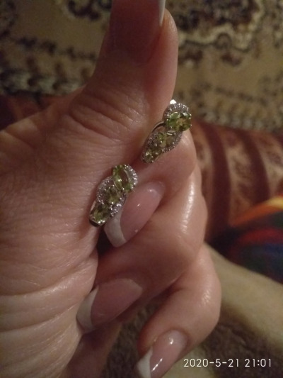 Нарядные, яркие, летние сережки. Можно и на каждый день. На ушке с небольшой мочкой очень удобно сели. Лёгкие, можно на ночь не снимать. Люблю хризолиты. Приобрела с удовольствием.