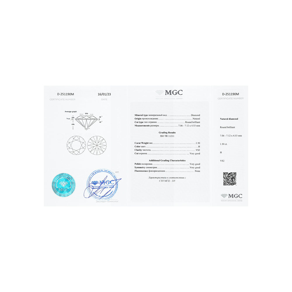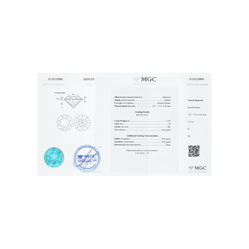 1 бриллиантом природным, 1.5 карат, огранка круг 57 граней, цвет 5, чистота 7, тип огранки А;