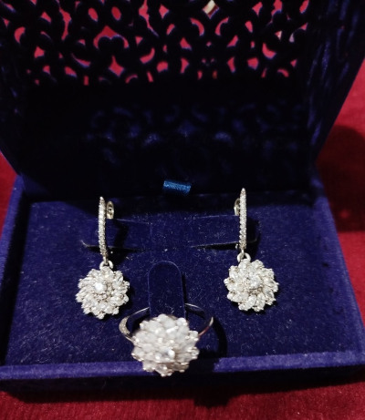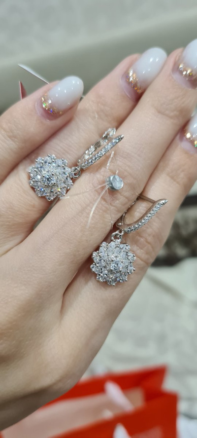Серьги очень красивые,(если никто не знает, что это серебро, никто не отличит, похоже на белое золото), серьги переливаются на свету, и на солнце, смотрится очень здорово. В комплекте смотрятся шикарно.