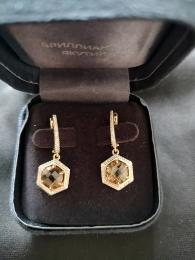 Золотые серьги с бриллиантами природными и кварцами дымчатыми природными