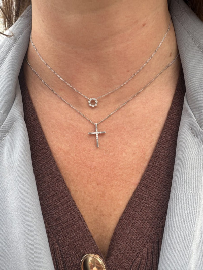 Волосы не накручиваются, ношу её с ещё одной цепочкой) блестит, сверкает, не снимаю, купаюсь тоже с ней, не темнеет) Брюлики блестят на солнышке)