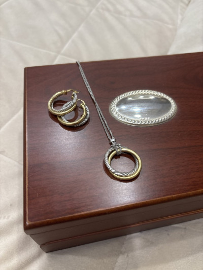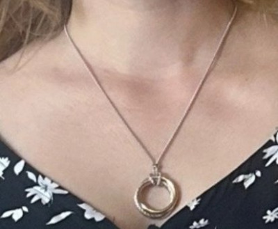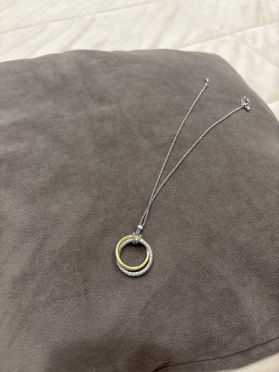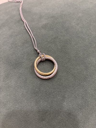 Подвеска приобреталась в комплекте в серьгами в магазине.Позднее приобреталось кольцо. Длина подвески регулируется.Безумно довольна покупкой этих изделий.Их можно носить,как в комплекте,так и каждое в отдельности. Благодаря сочетанию двух цветов металла украшения подходят,как брюнеткам так и блондинкам. Универсальные украшения для разных поводов и мероприятий. Однозначно рекомендую к покупке.