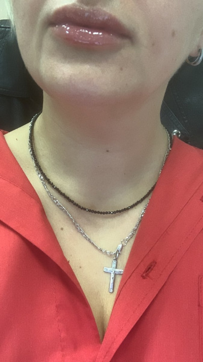 Смотрится отлично, можно как чокер или подлиннее, кулон также очень красиво, особенно крест, как настроение будет так и надел 👍😁, очень при очень понравилось!