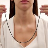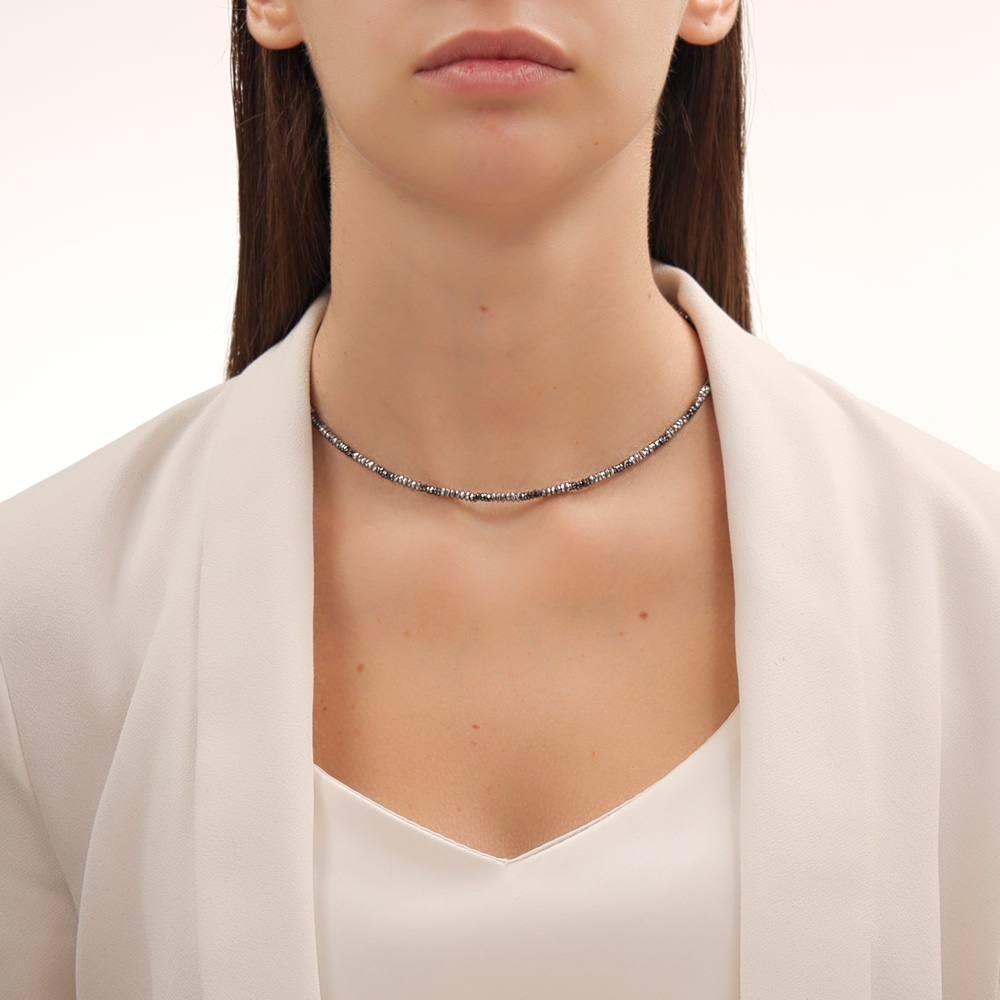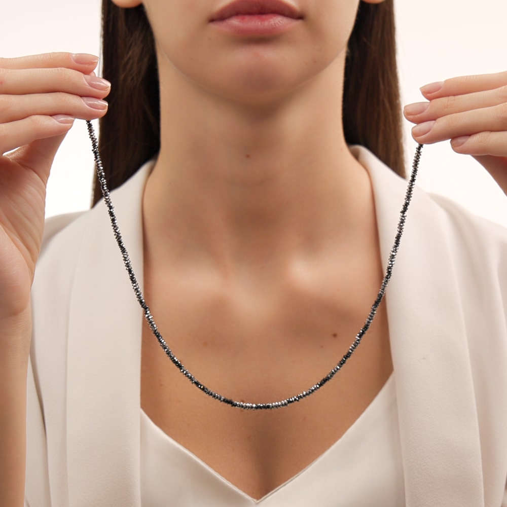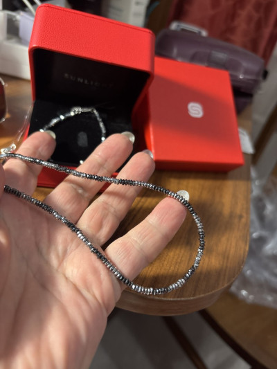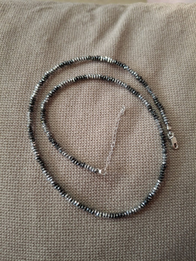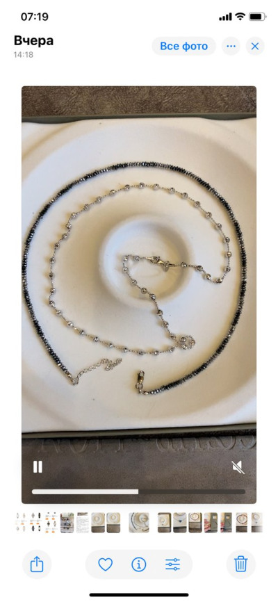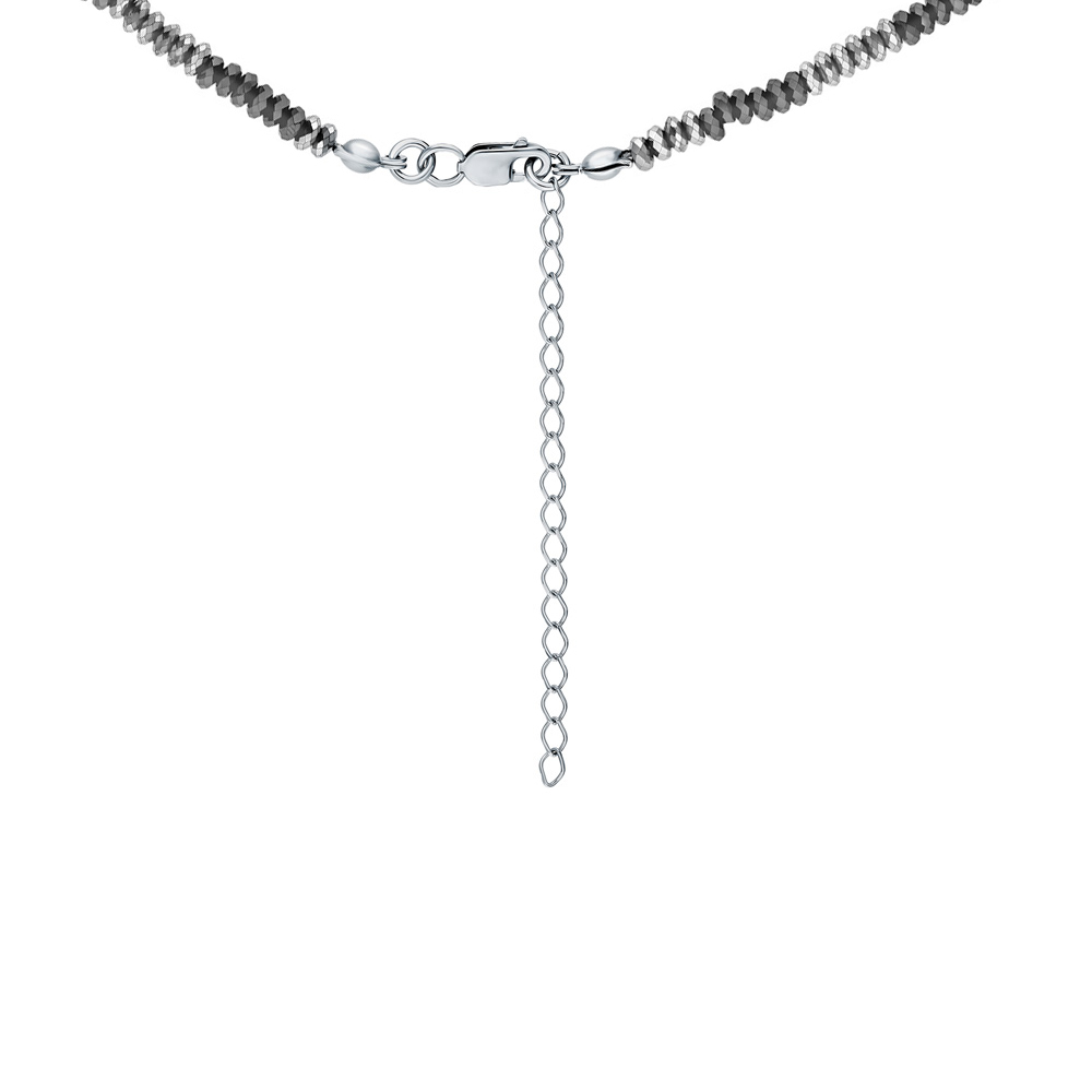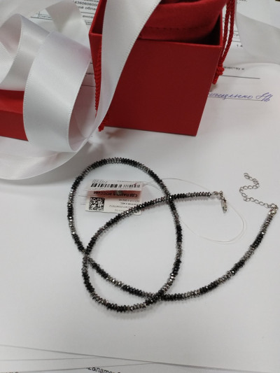 Переливается так, что глаз не оторвать, сверкать в нём будете издалека. Фурнитура серебро, замочек и удлинитель то точно. Крепление к тросику и тросик - сталь.