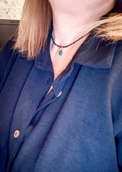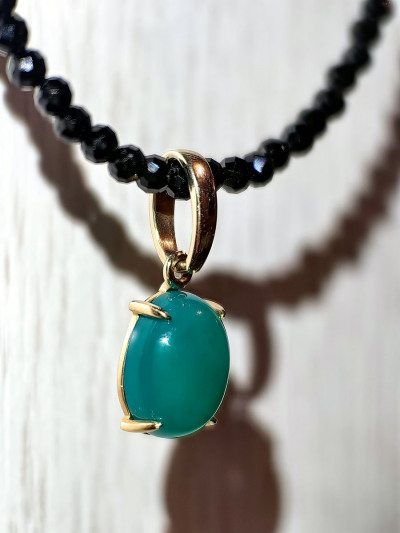 Подвеска из лимонного золота с натуральным агатом нежно-голубовато-зеленого оттенка гармонично сочетается с бусинами из черной шпинели. Заказала еще колечко из этой же серии, но увы, камень у кольца оказался более зеленого оттенка. Поэтому если заказывать, то заказывать несколько комплектов, чтобы иметь возможность подобрать. Я же решила комплект не собирать, а оставить в таком варианте как самостоятельное акцентное украшение.