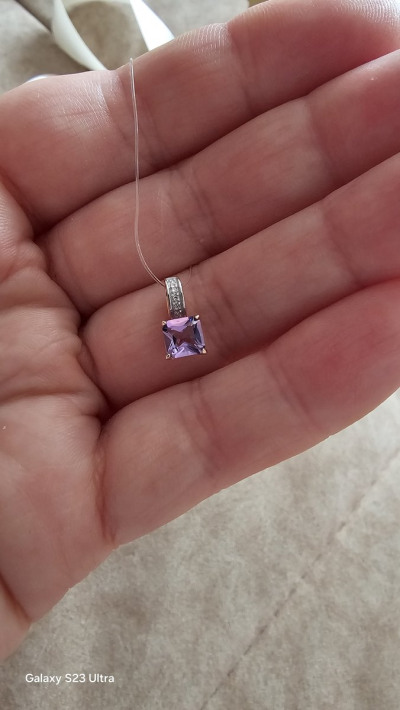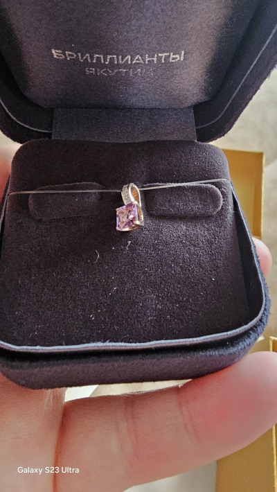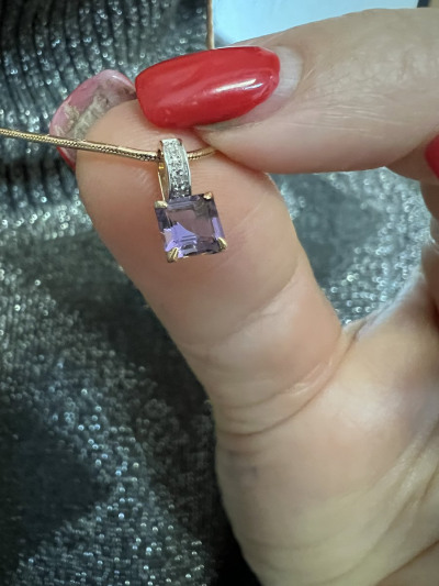 Подвеска очень красивая, нежная, размер соответствует описанию, на мой взгляд не маленькая. Аметист красиво блестит гранями, бриллианты, хоть и небольшие, но блестят замечательно. Потрясающе смотрится комплектом