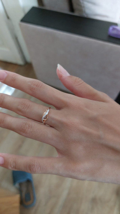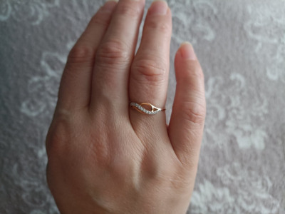Колечко понравилось с первого взгляда, уже при выборе в приложении🫰. Нежное, женственное😇. И ещё один плюс: размер обычного, круглого колечка на пальчик 18ый, но это колечко подошло на пол размера меньше, за счёт того, что верхнее полотно с камешками дугой👍