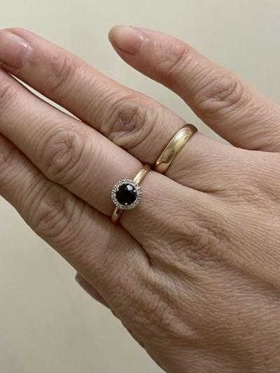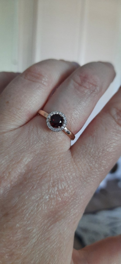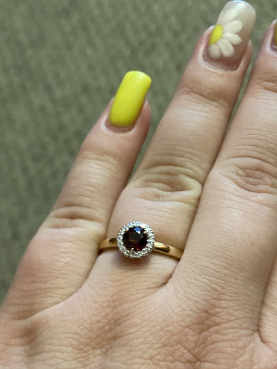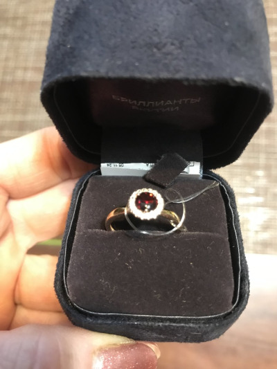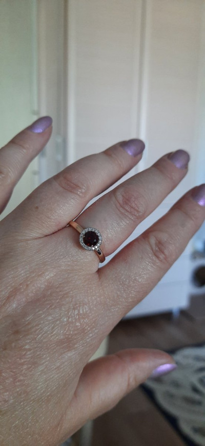 Давно это колечко лежало у меня в "избранном", а тут хорошая скидка-купила. В 17,5 размере, вес 2 грамма. Подбирала к пусетам с гранатом, хотелось комплект. Понравилось. Рекомендую. Спасибо SL!
