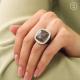 Интересное, самодостаточное и эффектное кольцо. В каталоге выглядит массивнее, чем на деле. Полновесное. Центральный камень серо-лиловый. Внутри родировано, снаружи родирование + черная эмаль. Внутри сетка, снимать легко. В тепле 1в1, в жару и холод +/- 0,5 мм соттветственно. Камень 15*15 мм, диаметр фианитов 1 мм, всё навершие 17*17 мм. Высота каста 4 мм. Шинка 10-5 мм, толщина 1,5 мм.