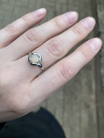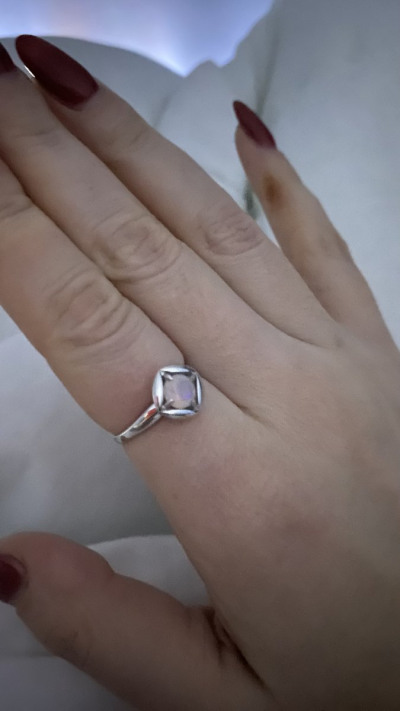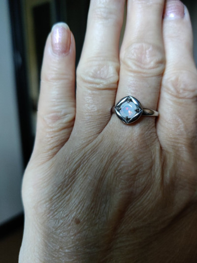 Приобретен в подарок в комплекте с сережками, колечко не тонкое, объемное, очень красиво смотрится на пальце, камушек переливается, очень красивое сочетание белого опала с серебром.