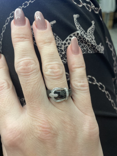Шикарно колечко в виде ремешка из чёрной керамики, смотрится оригинально и дерзко. Давно за ним охотилась. Наконец поймала по самой выгодной цене. Удачной охоты всем, рекомендую
