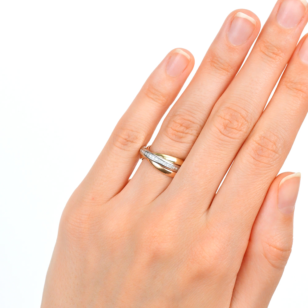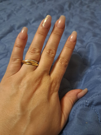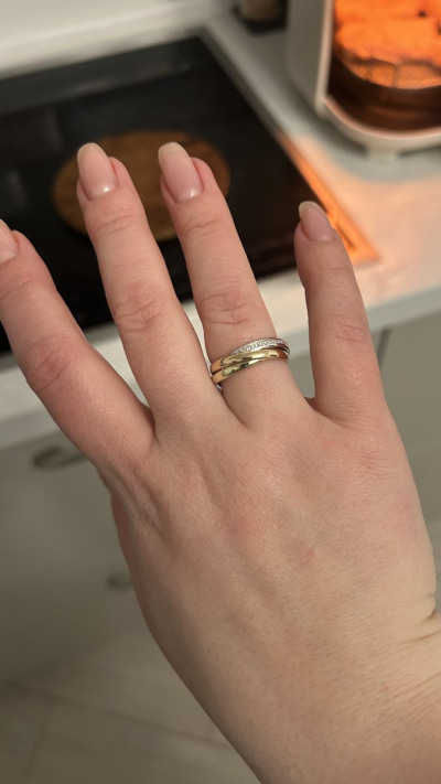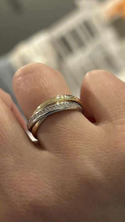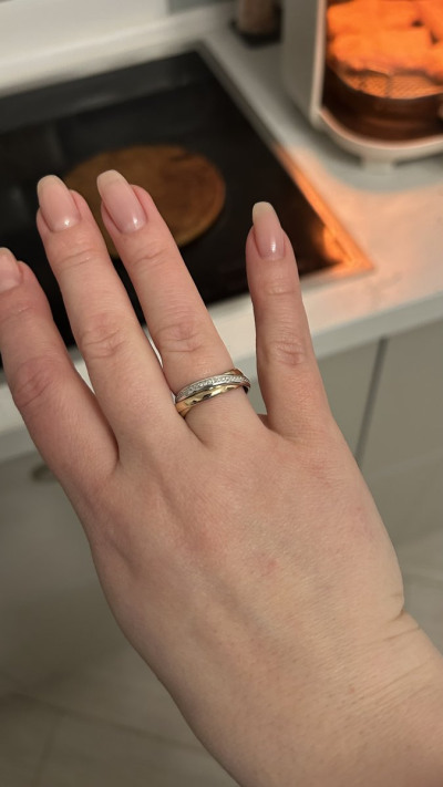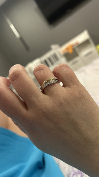 Какая красота! У меня было обычное Тринити без бриллиантов и кольцо из белого золота было без покрытия родием, соответственно через время носки они все три затерлись и стали неразличимы по цвету. В этот кольцо, благодаря бриллиантам и родию, будет все отлично четко различимы цвета. Ширина одного кольца примерно 2,5 мм. По размеру: обычно у меня кольца 17 размера, тут вязла два на выбор ( пока появились в наличии) и в итоге 16,5 очень свободно сидит, скользит по пальцу. В общем очень крутое!