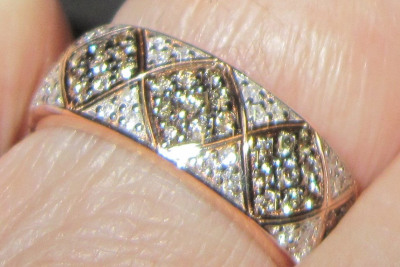 Совершенно случайно увидела это украшение на сайте sunlight... думала...думала... а когда женщина начинает долго думать, то это приводит только к одному результату.... И, вот, этот результат со мною рядом.... сказать, что рада - ничего не сказать... Украшение просто сияет радостью... излучает звездную россыпь коньячных и белых бриллиантиков... Давно не получала такого удовольствия даже просто от возможности любоваться этим произведением искусства, иначе я не назову это удивительно милое украшение! Ювелир - настоящий художник!!!! Огромное спасибо за подаренную радость от приобретения Вашего произведения! Кольцо довольно широкое, смотрится оооооооочень эффектно. Единственное, что нужно брать на пол-размера, а то и на размер больше, так как за счет вогнутых краев шинки немного маломерит. Спасибо, sunlight, за то, что в Вашей сокровищнице столько чудесных украшений!!!