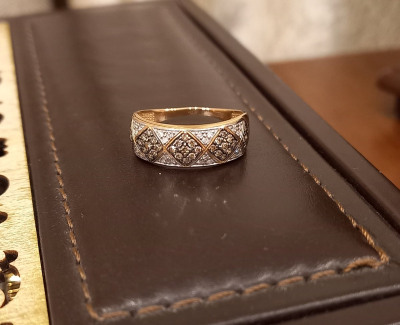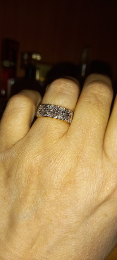 Присмотрела кольцо в комплект к серьгаи, но цена кусалась. Благодаря новогодней акции я - счастливая обладательница шикарного кольца с шикарными коньячными бриллиантами! На заметку: из-за загнутых внутиь краев кольца немного съедается размер (на фото), поэтому чуть маломерит, нужно мерить. Спасибо SL за новогодний подарок!