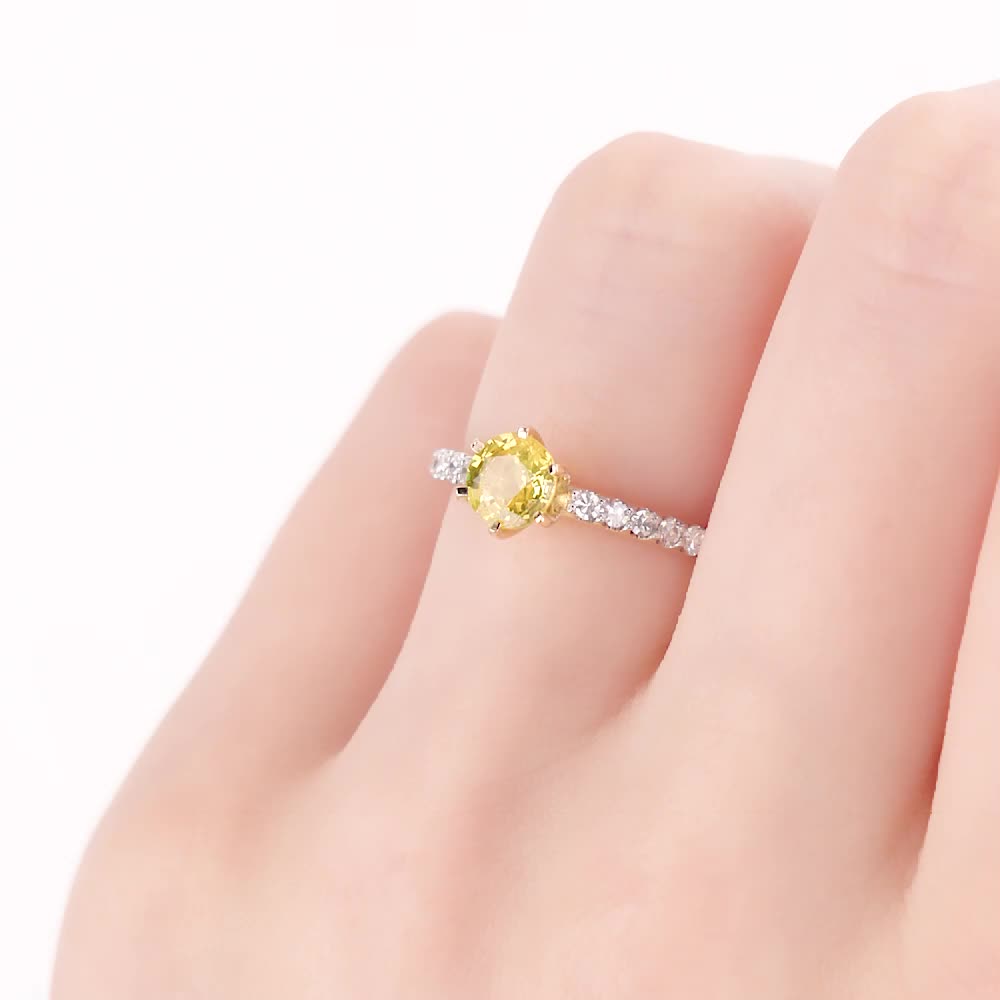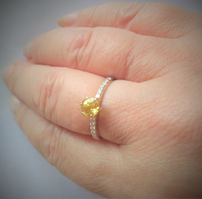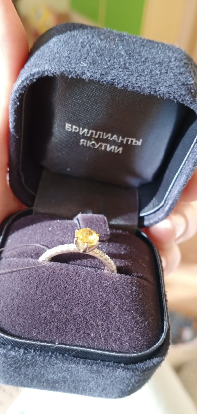 Кольцо выполнено из жёлтого золота 585 пробы, что усиливает яркость цвета вставки из жёлтого сапфира. По шинке украшено бриллиантами. Шинка толстенькая. На пальце заметно.