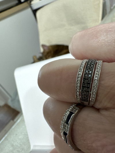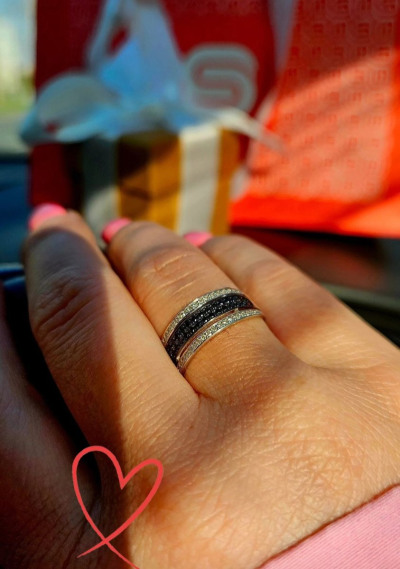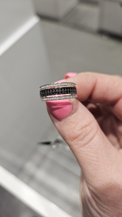Очень симпатичное кольцо.Классическая дорожка из черных и белых камней.Все гладко ,ничего не задевает.На пальце смотрится без просветов.