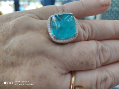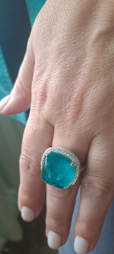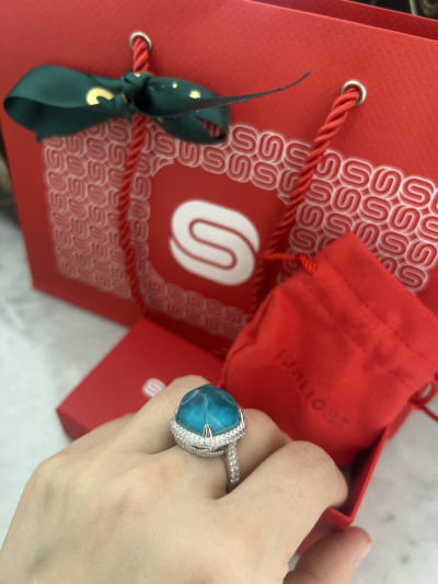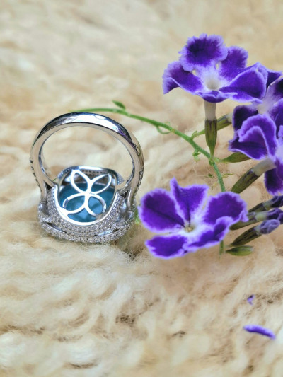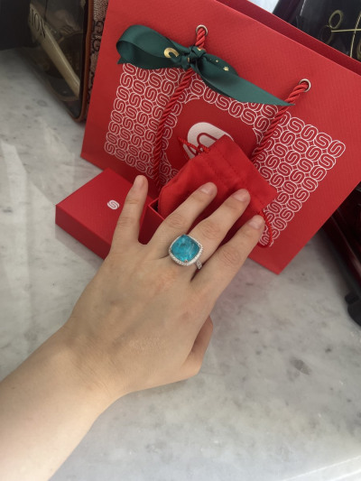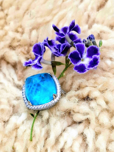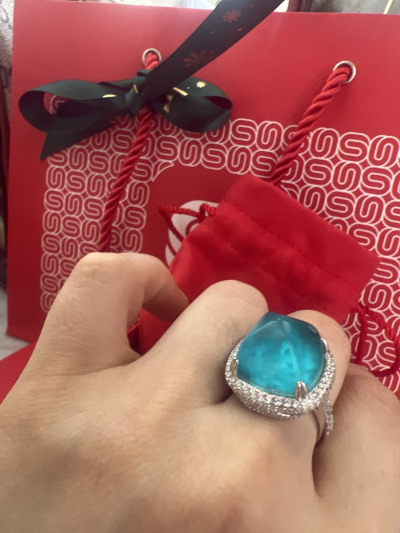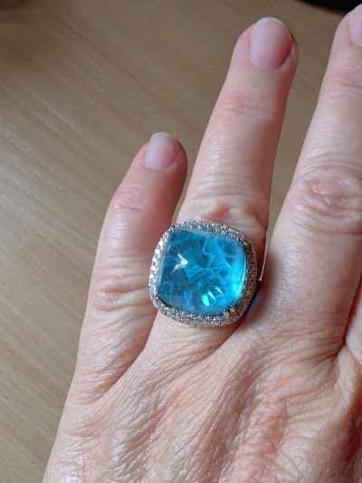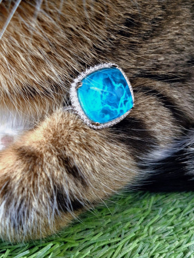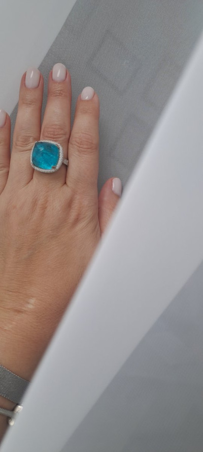 Роскошная оправа, высокий каст, весь усыпан фианитами, цвет вставки ярко бирюзовый, хотя верхний камень бесцветный, прозрачный, но основа бирюзовая. Смотрится богато, даже роскошно. Нравится, что форма вставки кабошон, без граней.