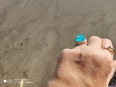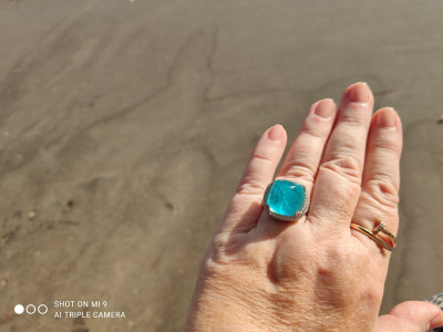 Невероятно красивое кольцо, выполненное в технике дублета - подложка, имитирует льдистую структуру и прозрачный кристалл сверху, эти украшения всегда смотрятся очень эффектно. Кольцо модного бирюзового оттенка, крупное, кристалл сильно выпуклый, перчатку сверху, пожалуй, не наденешь.