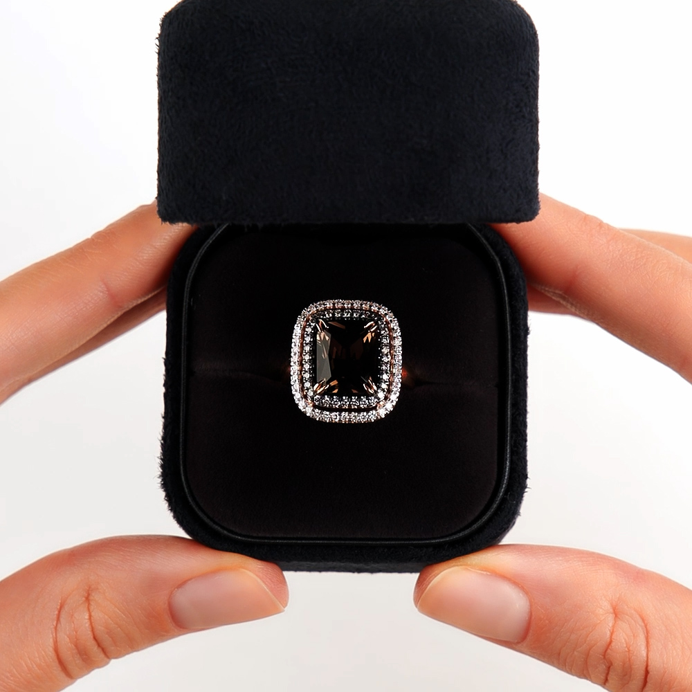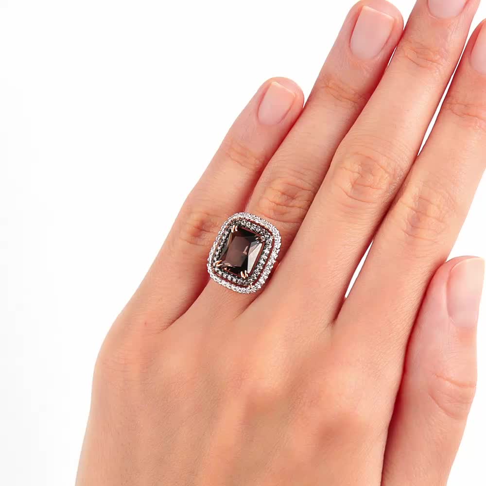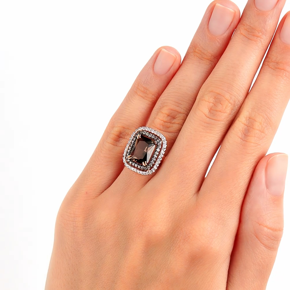 Это кольцо рассказывает историю теплого осеннего заката. Раухтопаз в центре напоминает о смолистых лесах, светящихся последними лучами солнца, глубокий и таинственный, он словно вечерняя дымка, скрывающая секреты. Обрамление из прозрачных и коньячных бриллиантов очаровывает взор, как танец золотистых и прозрачных росинок на траве или как звезды, сияющие в сумерках. Золотая оправа говорит о вечной элегантности и роскоши, символизирует силу и постоянство, а камни – магическую энергию, способную притягивать удачу и вдохновение.