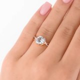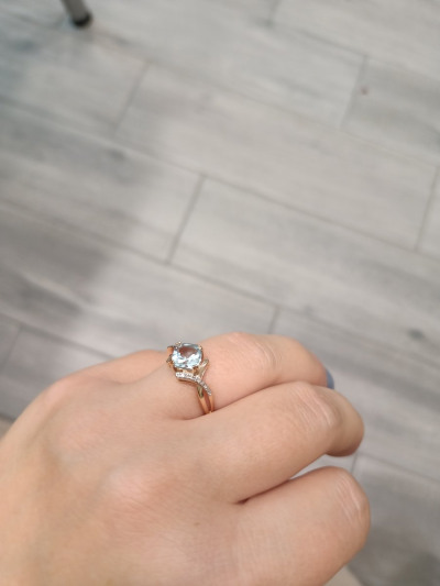 Это изысканное кольцо, украшенное 20 бриллиантами с круглой огранкой 17 граней, общим весом 0.036 карата, цветом 2 и чистотой 2, а также 1 топазом весом 1.5 карата. Все драгоценные камни установлены в розовое золото 585 пробы. Изделие весит 2.16 грамма. Произведено в России.