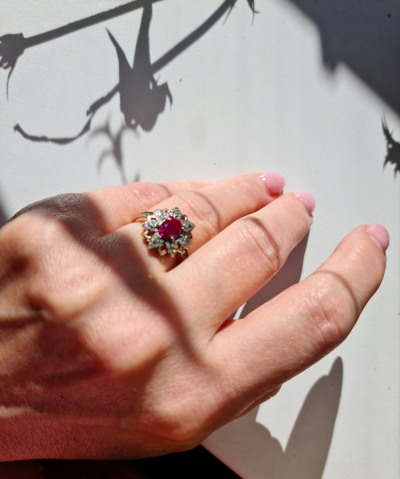 Золотое кольцо с коньячными бриллиантами и рубином