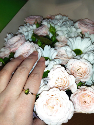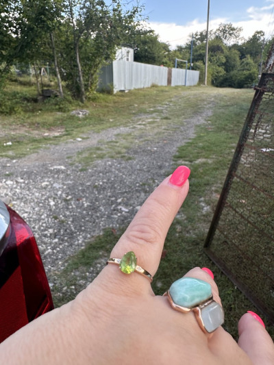 Давно хотела себе колечко именно с этим камнем. А эту модель присмотрела ещё больше года назад, но она долго не появлялась в наличии. И вот, как раз перед днём рождения младшего ребёнка колечко вновь стало доступно к заказу, чем я конечно же и воспользовалась и заказала себе подарок в честь знаменательного события. Ну что сказать, я в восторге. Камень яркий, весенний, солнечный. Бриллиантики хоть и маленькие, но вместе с хризолитом создают очень приятную и гармоничную картину. Кому-то может не нравятся столь тонкие кольца, но я люблю именно такие. Так что это то о чем я мечтала.