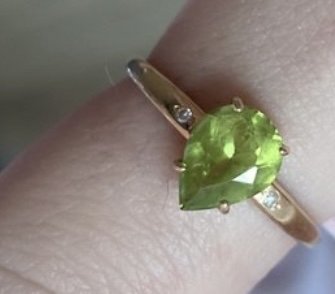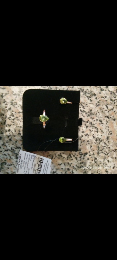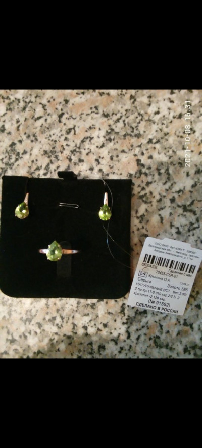 Колечко понравилось, симпатичное, с хризолитом и маленьким бриллиантиком. Взяла в комплект ещё и серьги такие же.