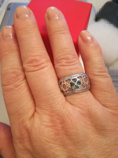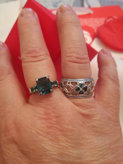 Понравилось сразу как увидела. интересный дизайн, давно хотела лондон топаз. кольцо широкое и выпуклое. на длинных пальцах смотрится шикарно, не скучно.