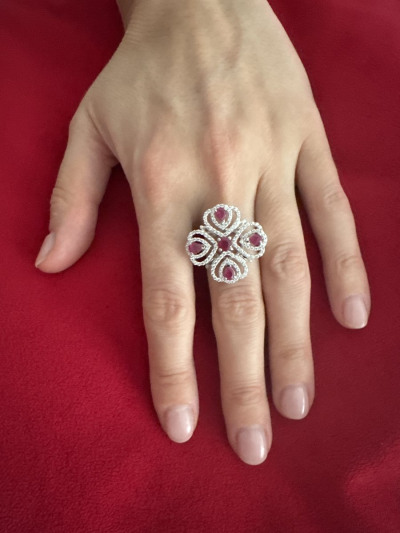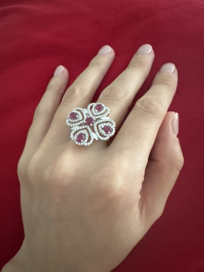 Серебряное кольцо с фианитами и рубинами природными