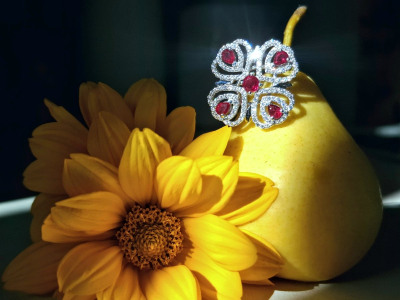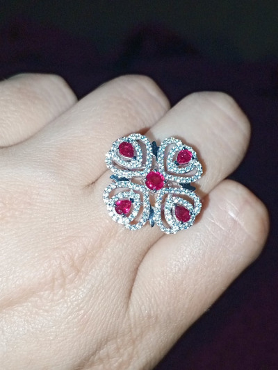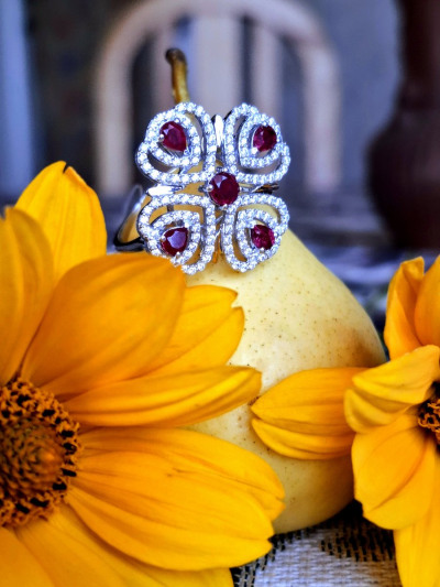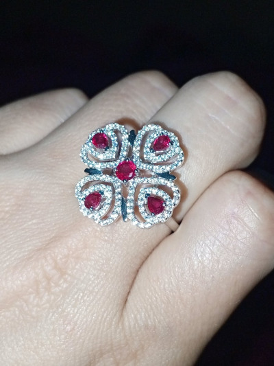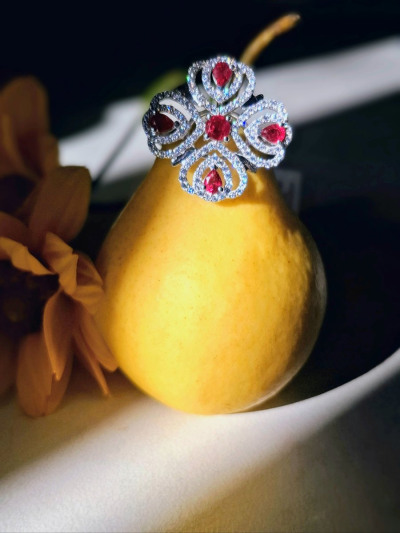 Дивное колечко с рубиновой росой на цветке из фианитов. Ажурное, праздничное, очень нарядное и приметное. На солнце искрится и переливается. Красота! P.S. Большемерит, имейте ввиду.